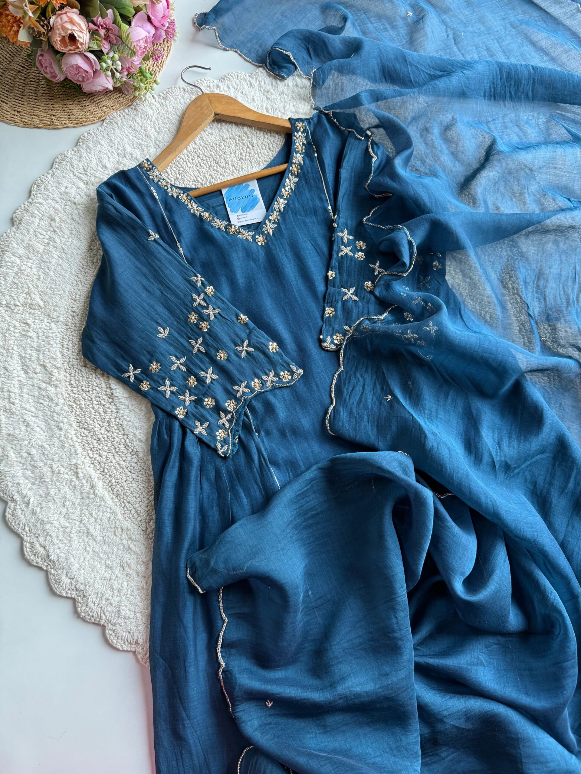 Crafted from airy, lightweight fabric, this kurta offers a smooth texture and graceful drape. Delicate floral embroidery adorns the neckline and sleeves, adding charm without overwhelming the design. The matching dupatta flows beautifully, enhancing the overall silhouette.